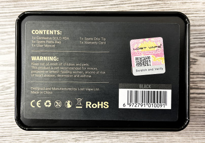 Приходит Lost Vape Centaurus Solo RDA в металлическом коробе, ощущается дорого-богато. На крышке расположено название устройства и логотип линейки Кентавров, а с обратной стороны наклейка, содержащая информацию о комплектации, различные предупреждения и скретч-код для проверки оригинальности.