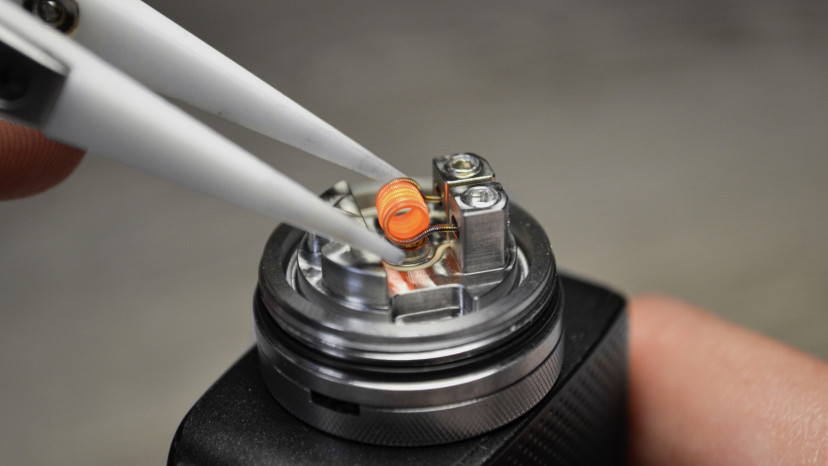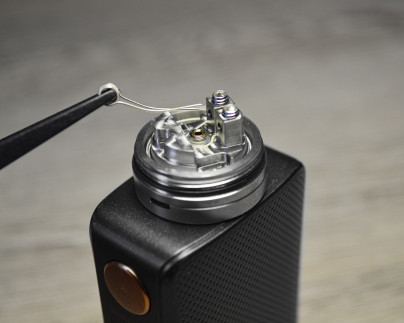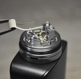 Сначала попробуем запустить атом на тех спиралях, что имеются в комплекте. Для этого нам понадобится снять колечко, затем выкрутить пару винтов на стойках. И сталкиваемся с первой трудностью – ставить койлы теперь не так удобно, так как мешается ограничитель испарительной камеры, из-за чего приходится ножки заранее подгибать.