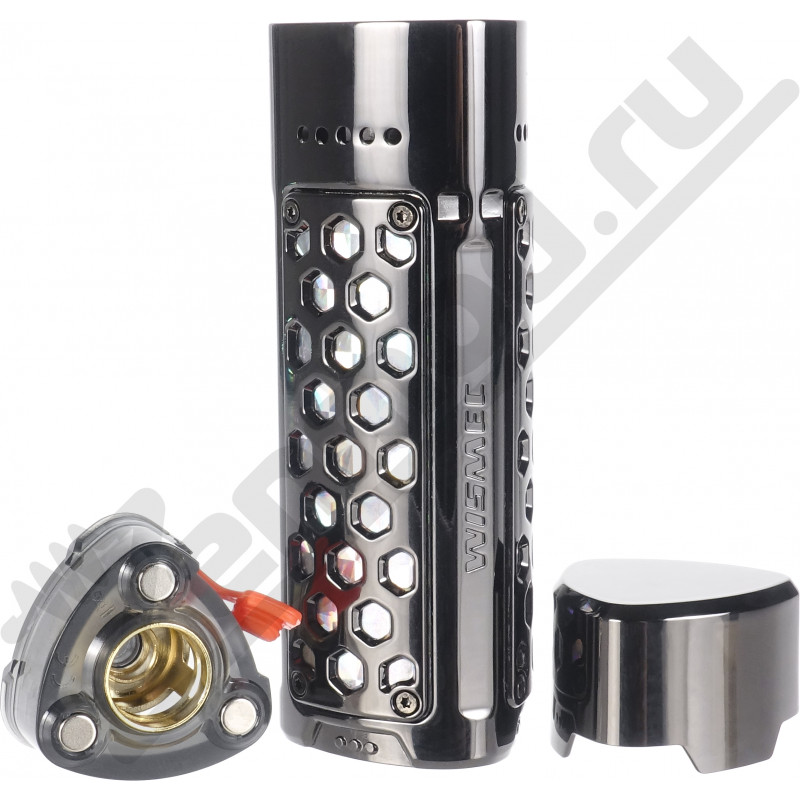 Под Wismec R40 получил уже знакомую треугольную форму, отсылающую на легендарную серию боксмодов Reuleaux. Габариты по сравнению с предшественником стали меньше – 96 мм в высоту и 27x27 мм по граням, в руке скрыться сможет. Спереди наблюдаем дисплей и кнопки управления, здесь все стандартно, по бокам же разместились панели с крупными ячейками, в которых виднеются яркие переливающиеся вставки.